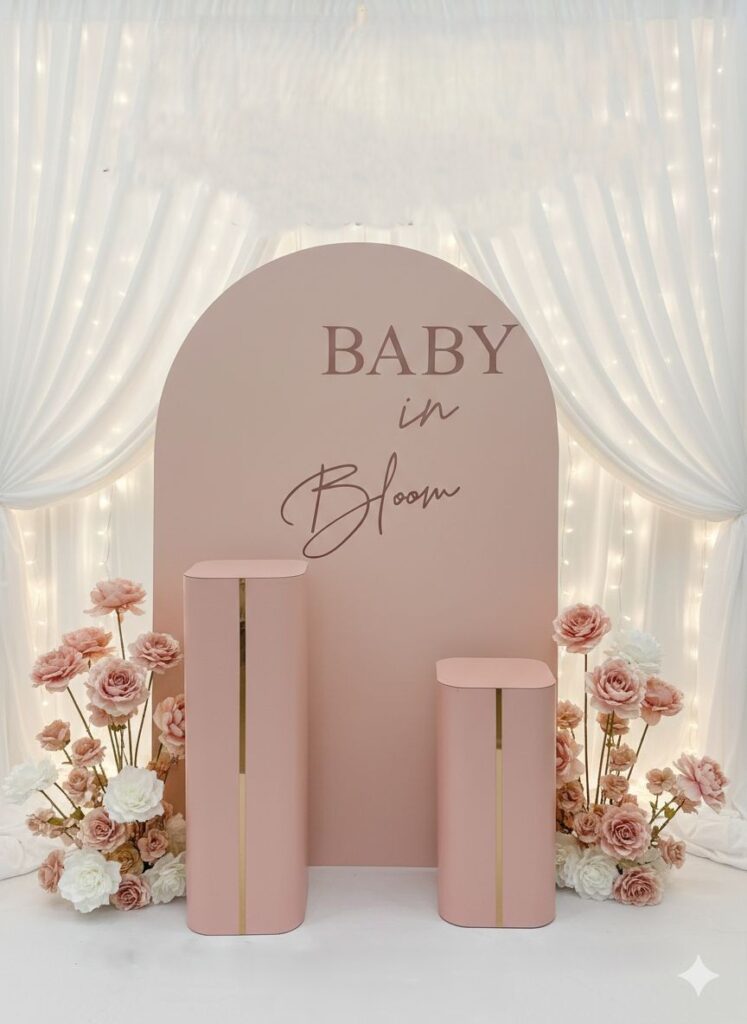 Arche et colonnes «Baby Shower»450$ Arche de 4x6pi(122x182cm) avec colonnes assorties de 2pi(60cm) et de 3pi(90cm), personnalisation selon le thème.