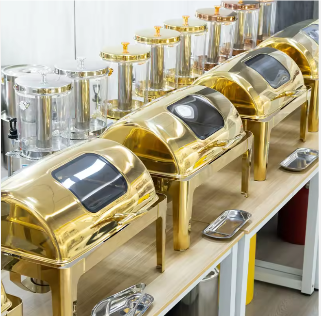 Réchauds deluxes dorés20$ 9 litres rectangulaire à fenêtre Grands ustensiles de service2$ chacun À utiliser avec les réchauds en différents modèles.Réservez dès maintenant N’attendez pas que quelqu’un est déjà réservé votre date. Réservez